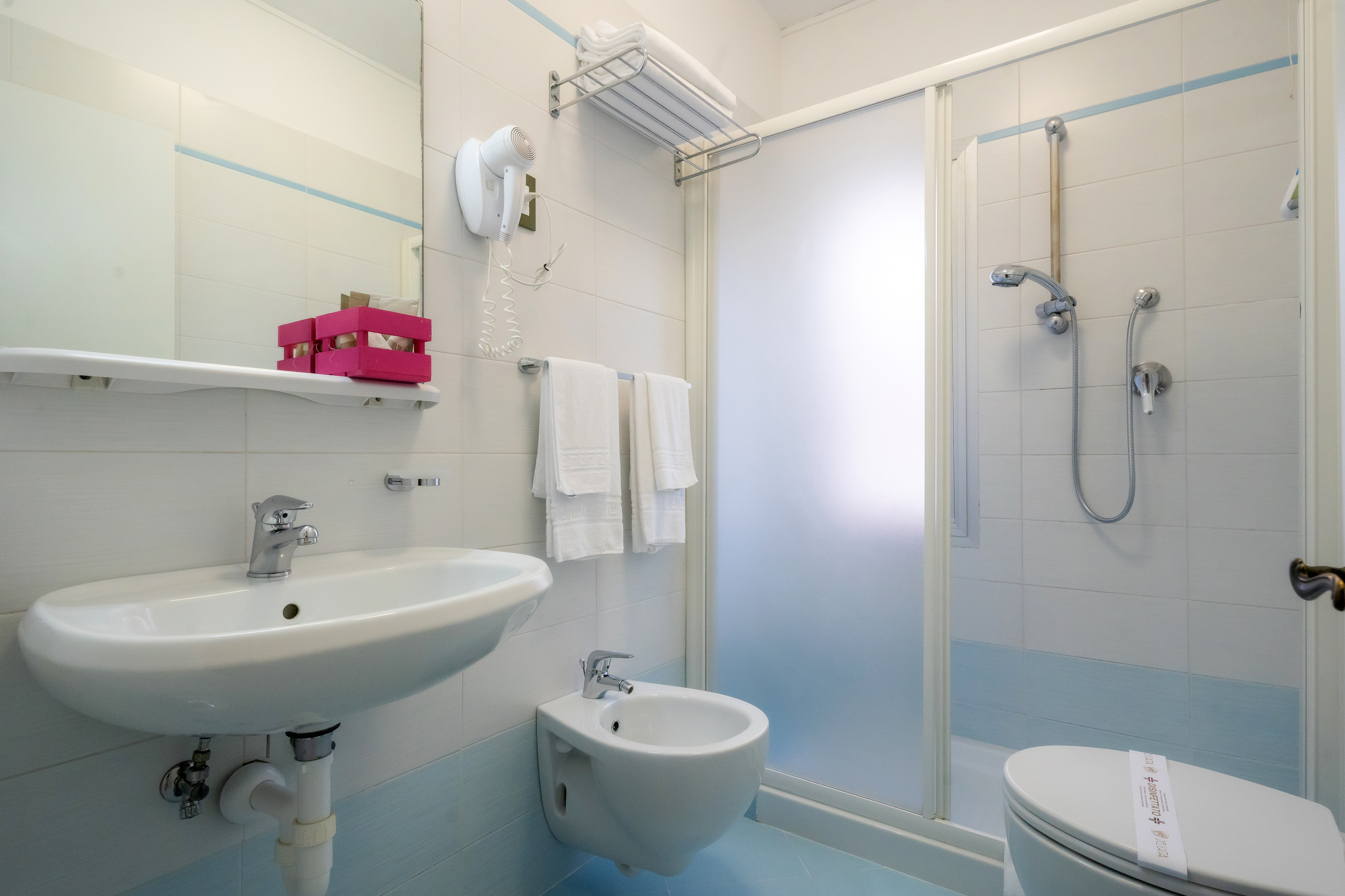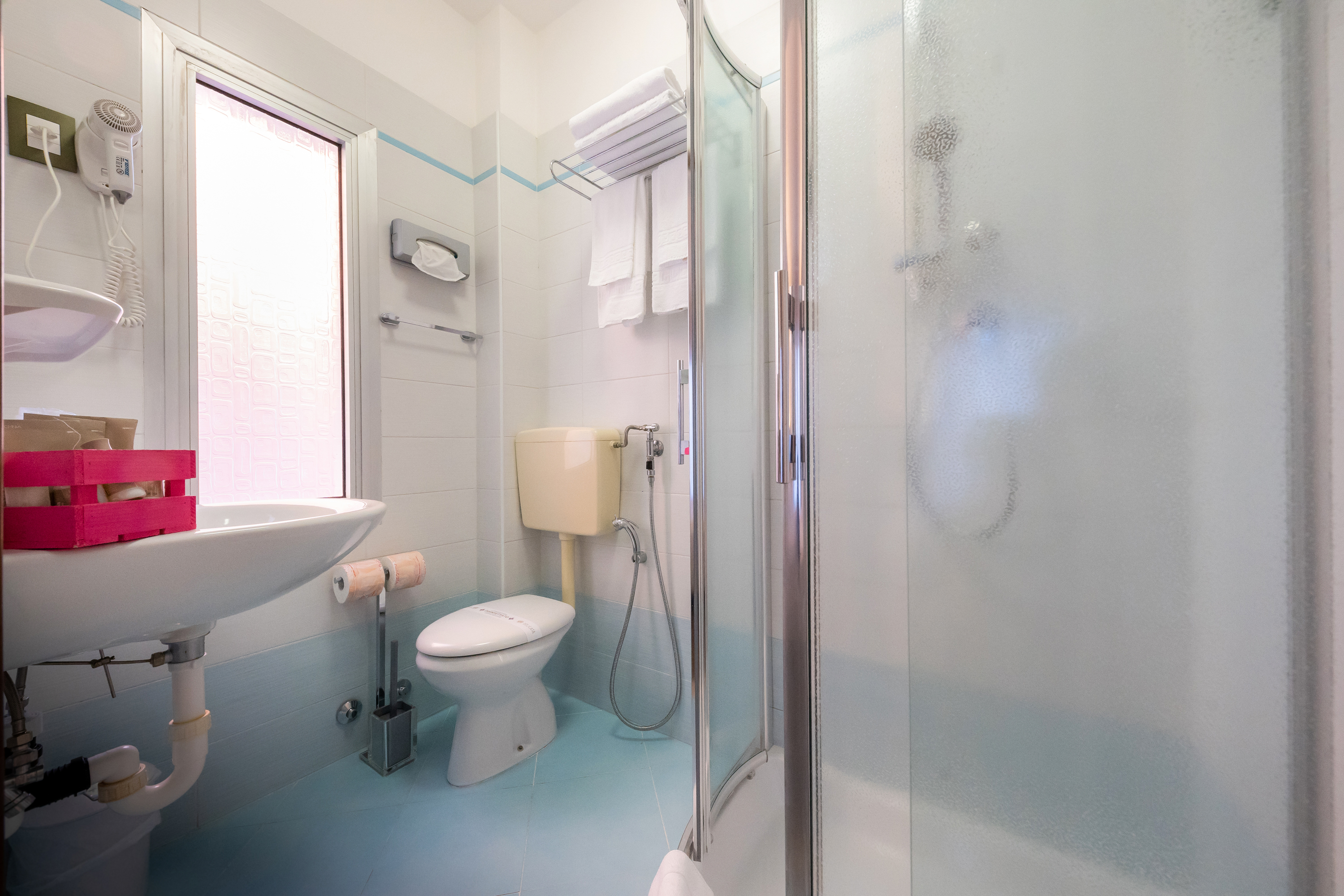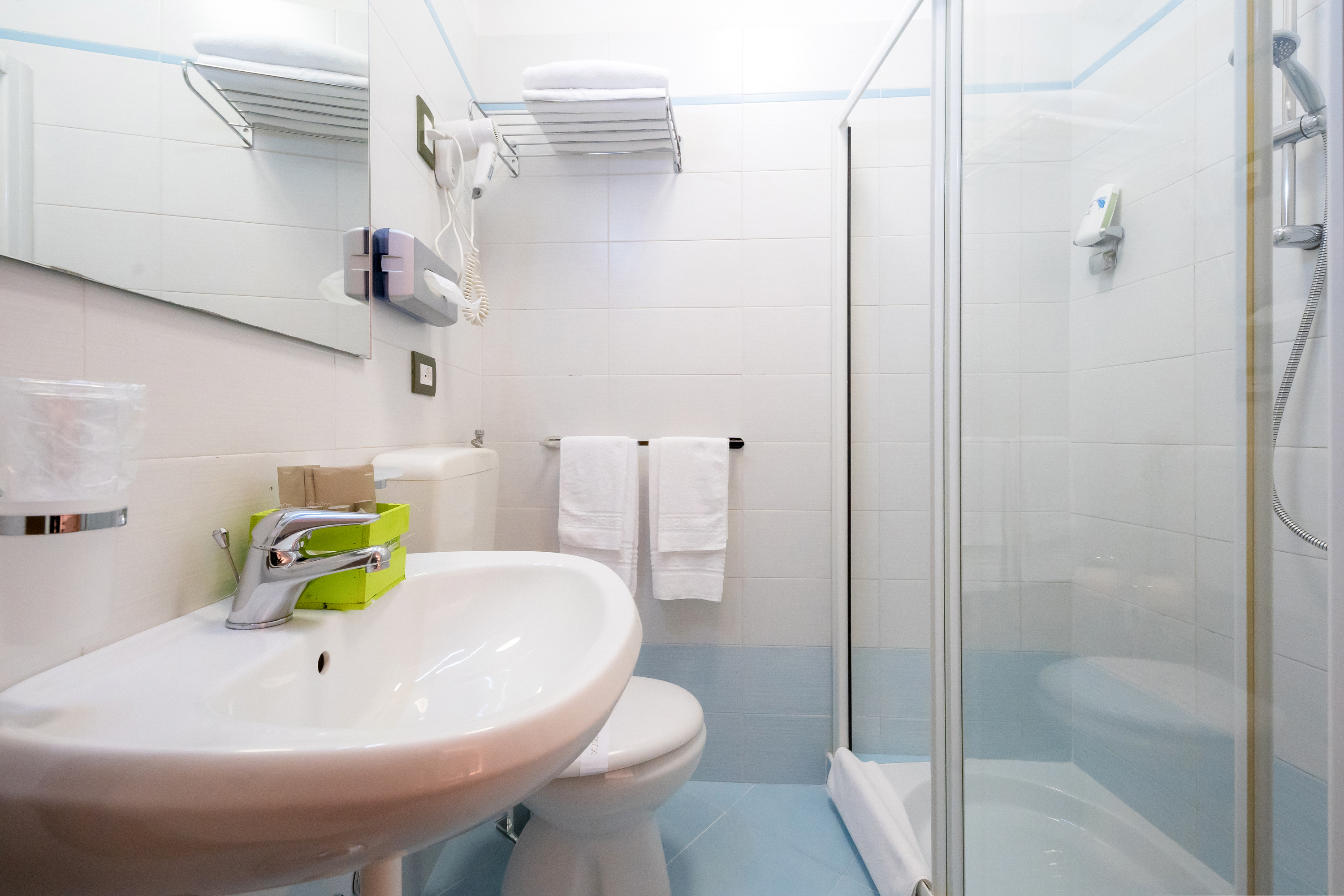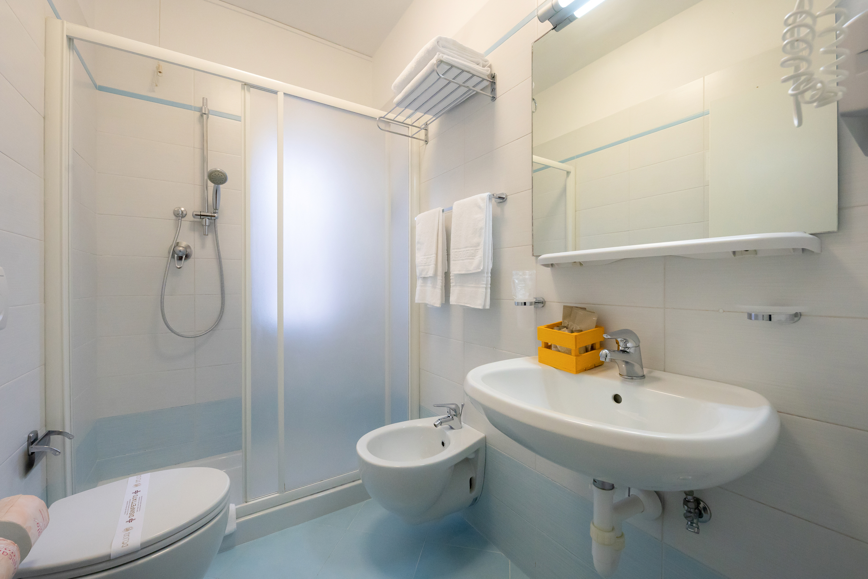 Tastefully furnished, all double rooms are equipped with all comfort: air conditioning /heater with self control panel, free internet wi-fi connection, flat-screen tv, courtesy kit and telephone. All double rooms have their own bathroom with wc – shower and hairdryer (daily towels changing included) .