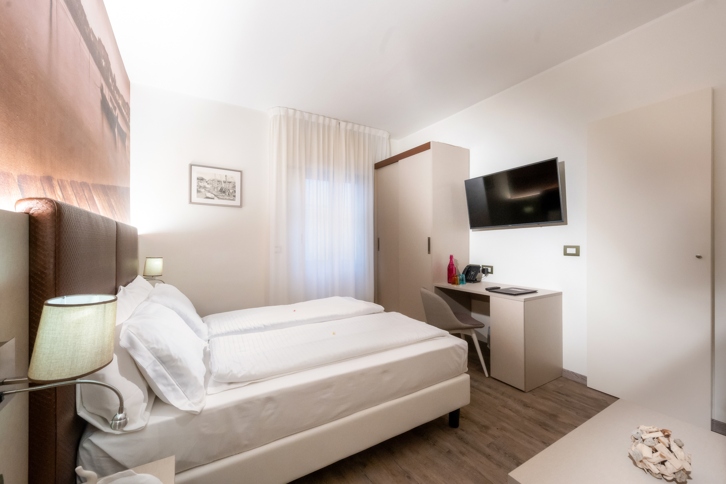 La camera quadrupla è composta da 2 camere matrimoniali comunicanti. Ogni camera è dotata di letto matrimoniale, aria condizionata/riscaldamento con controllo autonomo, connessione internet Wi-Fi gratuita, TV LCD schermo piatto, linea di cortesia e telefono. Il bagno, comune tra le due stanze, dispone di doccia, asciugacapelli, kit di cortesia e asciugamani. Ideali per chi ama viaggiare in famiglia o per piccoli gruppi di amici